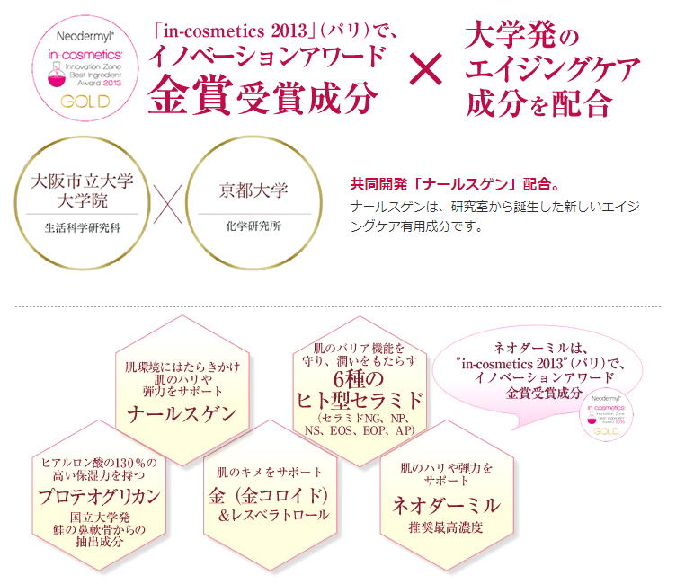 ネオダーミルは、2013年4月にフランス(パリ)で開催された世界最大の化粧品原料展示会 In-cosmetics の Inovation Best Award で、最も優れた化粧品原料として金賞を受賞した成分です。