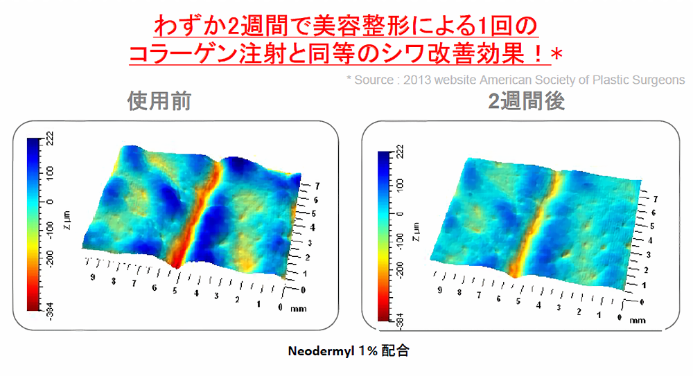 実験基材にネオダーミル1%配合したものを肌に塗り続けた結果、わずか2週間で美容整形による1回のコラーゲン注射と同等のシワ改善効果が認められたという報告があります。