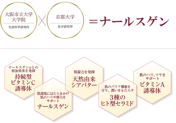 ナールスゲンは、京都大学化学研究所の平竹潤教授グループと大阪市立大学大学院の小島明子准教授グループとの共同研究から生まれたエイジング・スキンケアのための化粧品原料で、その作用に関して、科学的根拠があり、安全性と安定性についても確認されています。