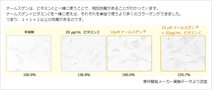 ナールスゲンとビタミンCを併用すると、ナールスゲンを単独で使用した場合にコラーゲンの産生量が増えることがわかっています。